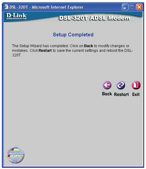 La configurazione del D-Link DSL-320T è terminata; un click su restart per il riavvio del modem è necessario per salvare la configurazione.