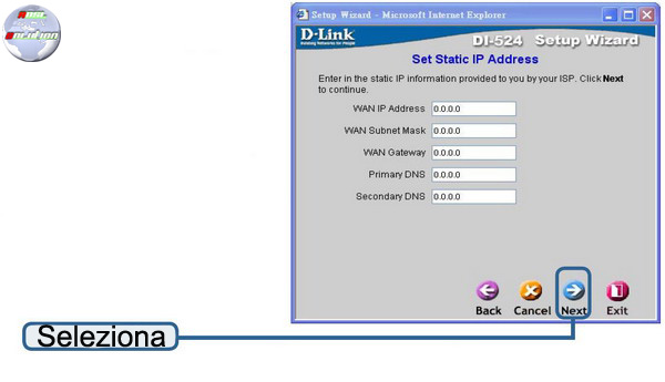 Se l’ISPrichiede un Indirizzo IP statico e la relativa opzione è selezionata, viene visualizzata la seguente finestra in cui inserire le informazioni IP fornite dall’ISP.