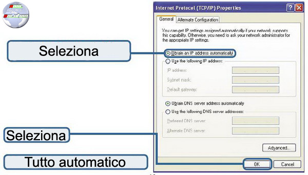 Selezionare "Ottieni un indirizzo IP automaticamente"