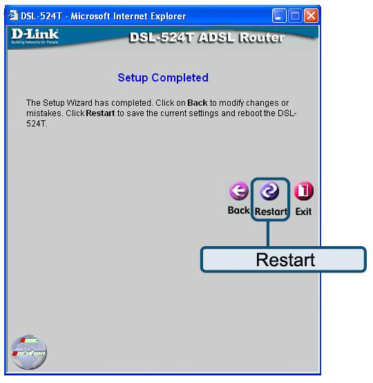 Cliccare sul tasto Restart per salvare le nuove impostazioni e per riavviare il D-Link DSL-524T.