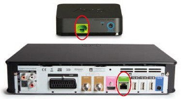 - Collega il cavo ethernet, inserito nello Sky Link, al decoder Sky (l’ingresso ethernet è di colore verde)