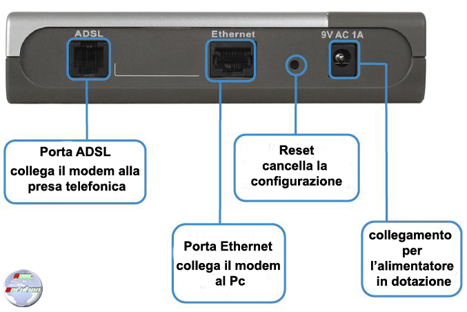 Il pannello posteriore del D-Link DSL-320T mostra quanto descritto in figura;