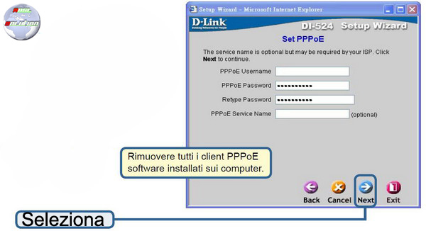 Se l’ISPutilizza il protocollo PPPoE (Point-to-Point Protocol over Ethernet), e la relativa opzione è selezionata, viene visualizzata la seguente finestra:
