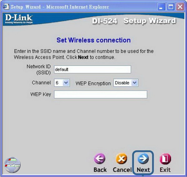 Dopo aver cliccato su "NEXT" hai la possibilità di configurare la sezione Wi-Fi con chiave criptata del D-Link DI-524 Router wireless AirPlus G.