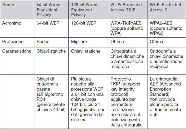 Di seguito una tabella riassuntiva sulle chiavi di protezione wireless e le loro caratteristiche: