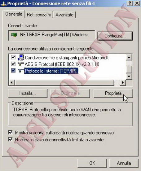 4) Selezionare Protocollo Internet TCP/IP e premere Proprietà: