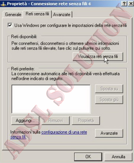 7) Nel caso in cui il rettangolo bianco “Reti preferite” sia vuoto, andare direttamente al punto 8, altrimenti le reti presenti e rimuoverle tutte: si tratta di reti Wi-Fi predefinite ricercate, ad esempio, dal pc in altra sede. Una volta che il rettangolo “Reti preferite” risulta vuoto, premere OK e ripartire dal punto 3.