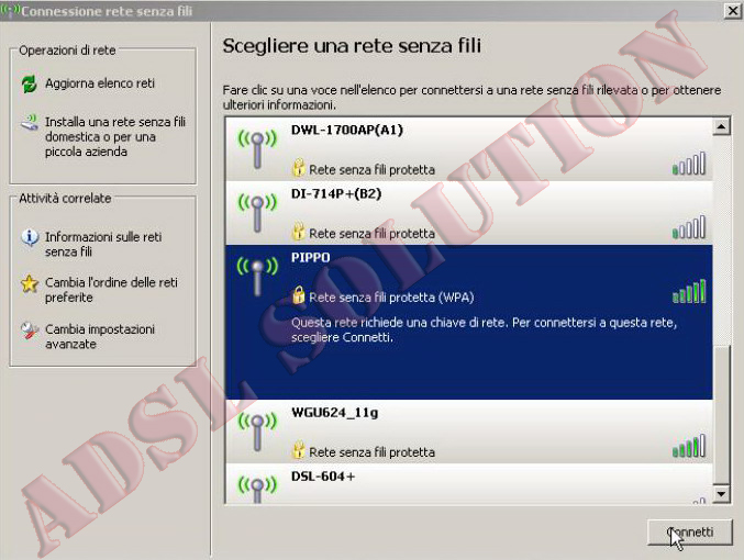 9) Comparirà una videata simile alla seguente nella quale si andrà a cercare la propria rete senza fili (riconoscibile dal nome inserito su SSID, nel nostro esempio “PIPPO” o semplicemente Netgear se non lo abbiamo modificato);