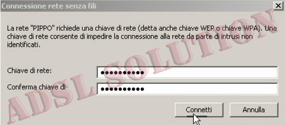 Digitare nel campo “Chiave di rete” la chiave (WEP, WPA-PSK) impostata durante la configurazione del Netgear DGN2000 e riscriverla nel campo “Conferma chiave di”