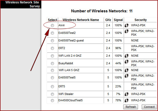 ora non dovremo fare altro che uno Scan delle reti wireless e connetterci alla rete del nostro modem router sorgente come evidenziato nell'immagine sottostante