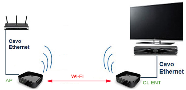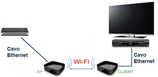 In questo esempio il segnale wireless del modem copre la distanza che lo separa dallo SKY LINK che a sua volta è collegato attravero un cavo ethernet al Decoder di SKY;